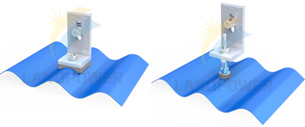 Landpower design various solar mounting solutions for Corrugated Roofs,we have hanger bolt solutions for wooden purlin, aluminum corrugated roof clamp for steel purlin, mini rails for simply installation,and L feet for simple installations, we also supply railing and rail-less mounting solutions for both landscape and portrait layout installation.